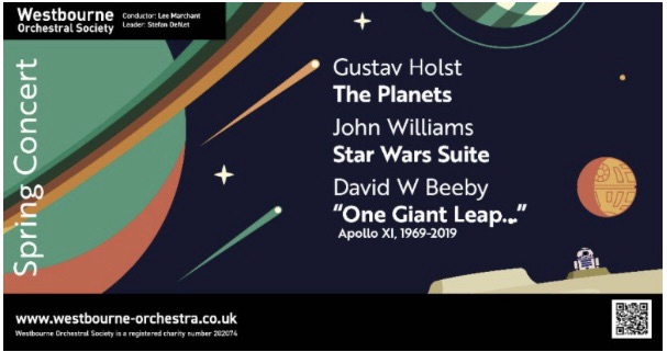 David’s orchestral piece “One Giant Leap…” is a large-scale piece written to commemorate the 50th anniversary of the first moon landing by Apollo XI in July 1969. The music was commissioned by Michael Armstrong (no relation to Neil!) and the Music Education Agency “SoundStorm” and first performed in a Festival at Upton House, Poole in July 2019. Another performance, marking the 55th anniversary, took place in May 2024, in a concert given by the Westbourne Orchestra. David’s music was in good company – performed alongside John Williams’ ‘Star Wars’ Suite and Gustavia Holst’s ‘Planets’ Suite!